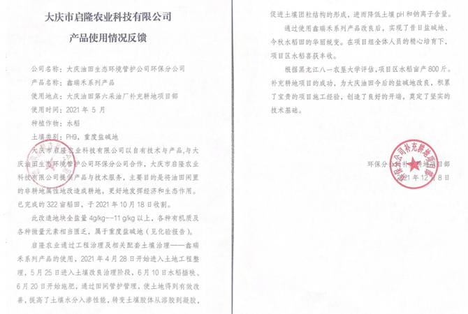與多所高校、研究院、各大種業企業合作種植改良鹽堿地水稻。在黑龍江、吉林、內蒙古等地有多處示范基地。在新疆等地區種植草木,環(huán)境綠化等工程。幾年來,啟隆人大力弘揚“創新、堅韌、拼搏、開拓”的企業精神,在研發(fā)上勇攀高峰。大慶啟隆 的企業宗旨是“誠信于鹽堿地的朋友,服務于鹽堿地的朋友”,努力為鹽堿地改良做出積極的貢獻。
